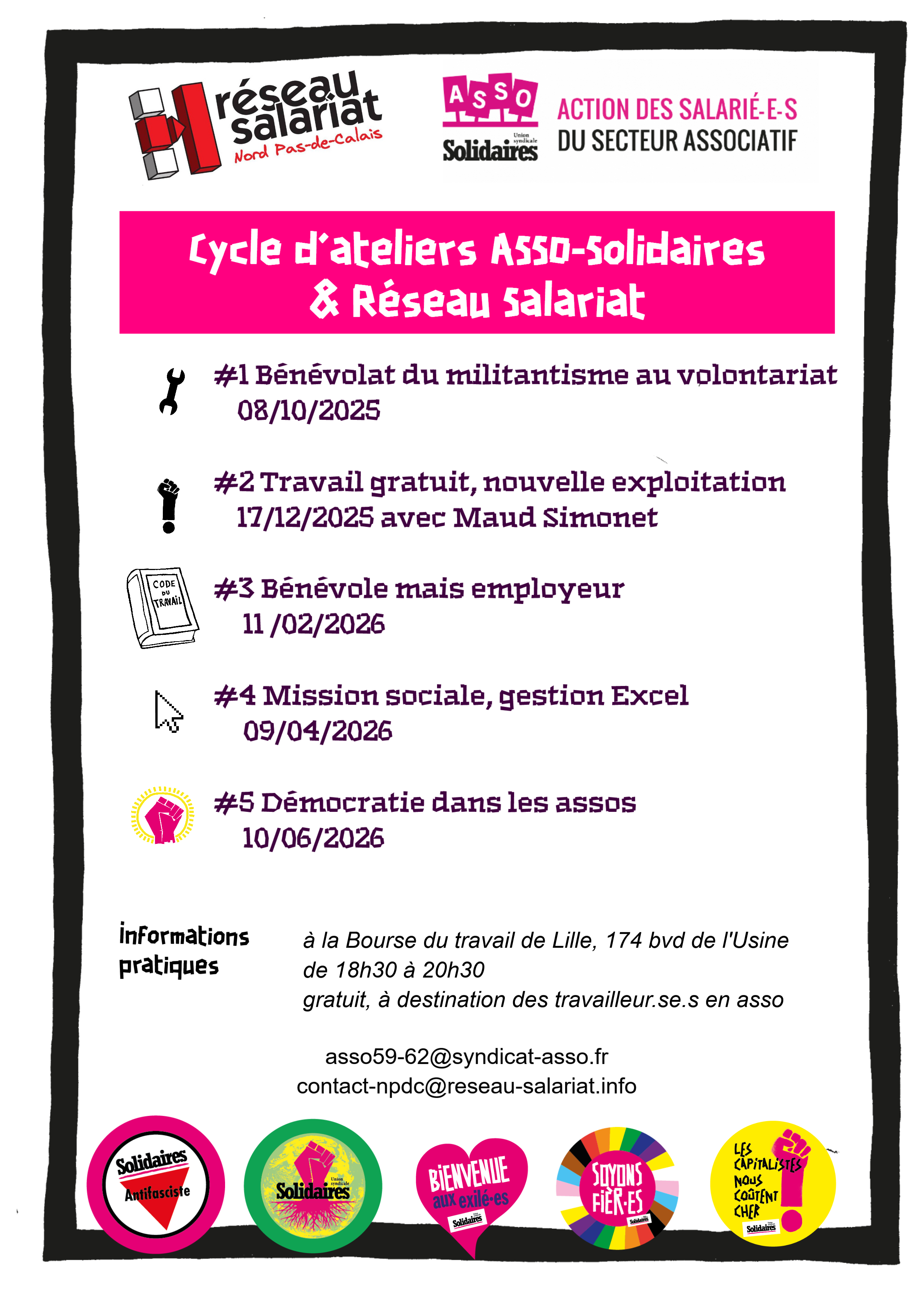 Le syndicat ASSO-Solidaires et le groupe local de Réseau Salariat vous invitent à un cycle d’ateliers organisé sur le salariat associatif, à la Bourse du travail de Lille (174 bvd de l’Usine), de 18h30 à 20h30.