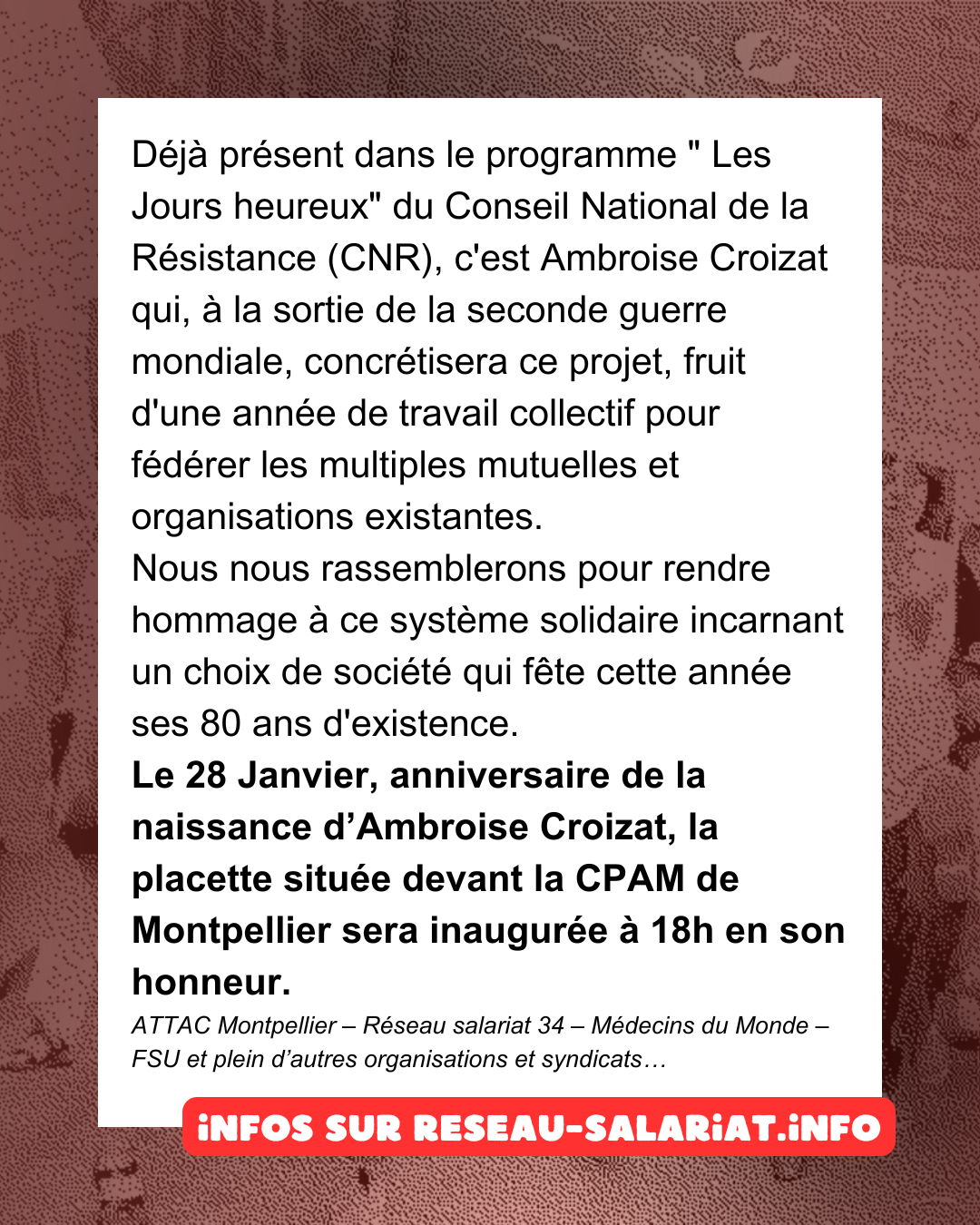 Le 28 janvier, jour anniversaire de la naissance d’Ambroise Croizat, nous nous rassemblerons pour lui rendre hommage. À cette occasion, la placette située devant la CPAM de Montpellier sera inaugurée symboliquement en son honneur à 18h.